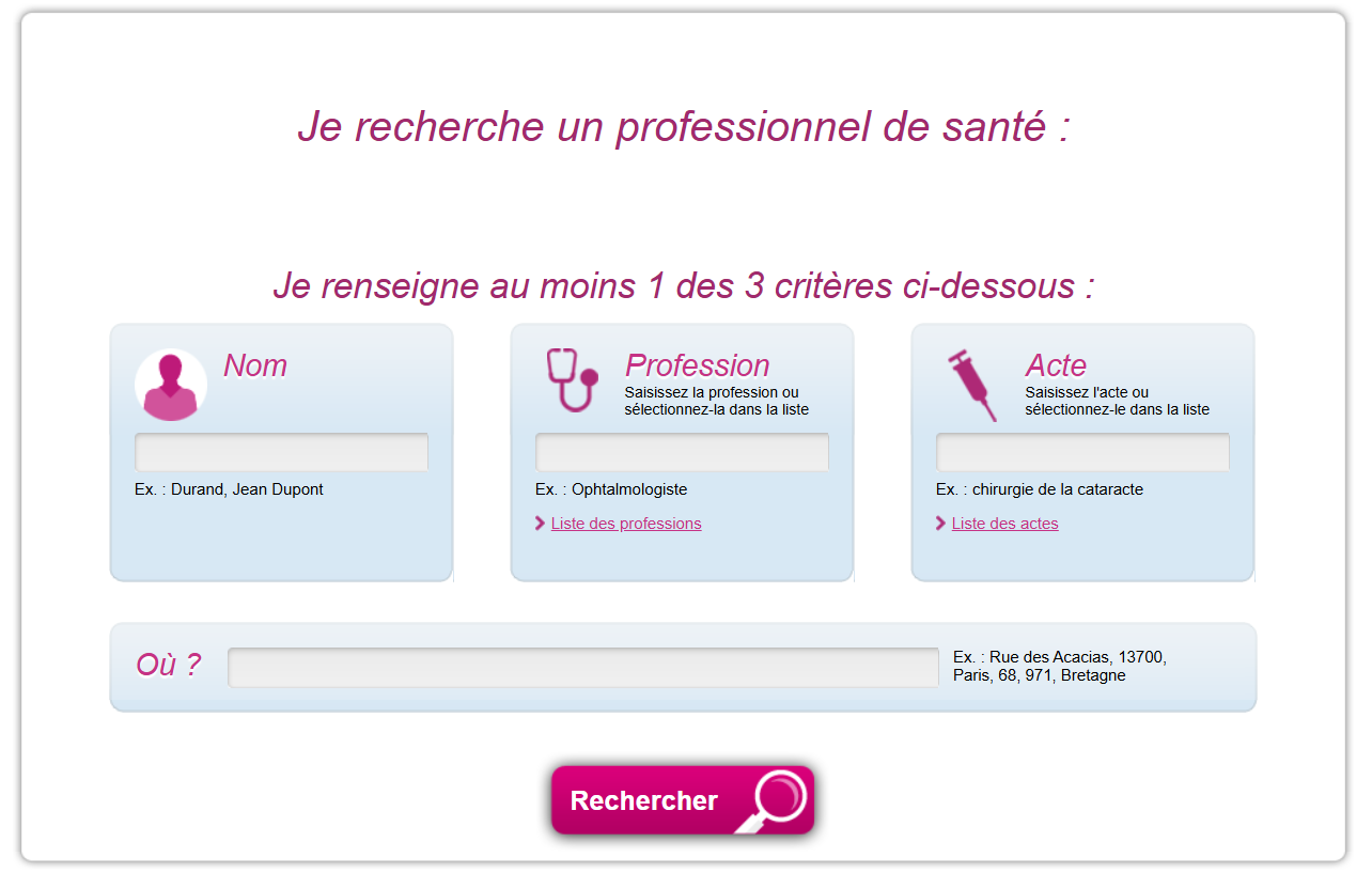 Cet annuaire concerne l’ensemble des professionnels de santé : médecins, dentistes, infirmière, ambulancier, kinésithérapeute, orthophoniste, etc.
